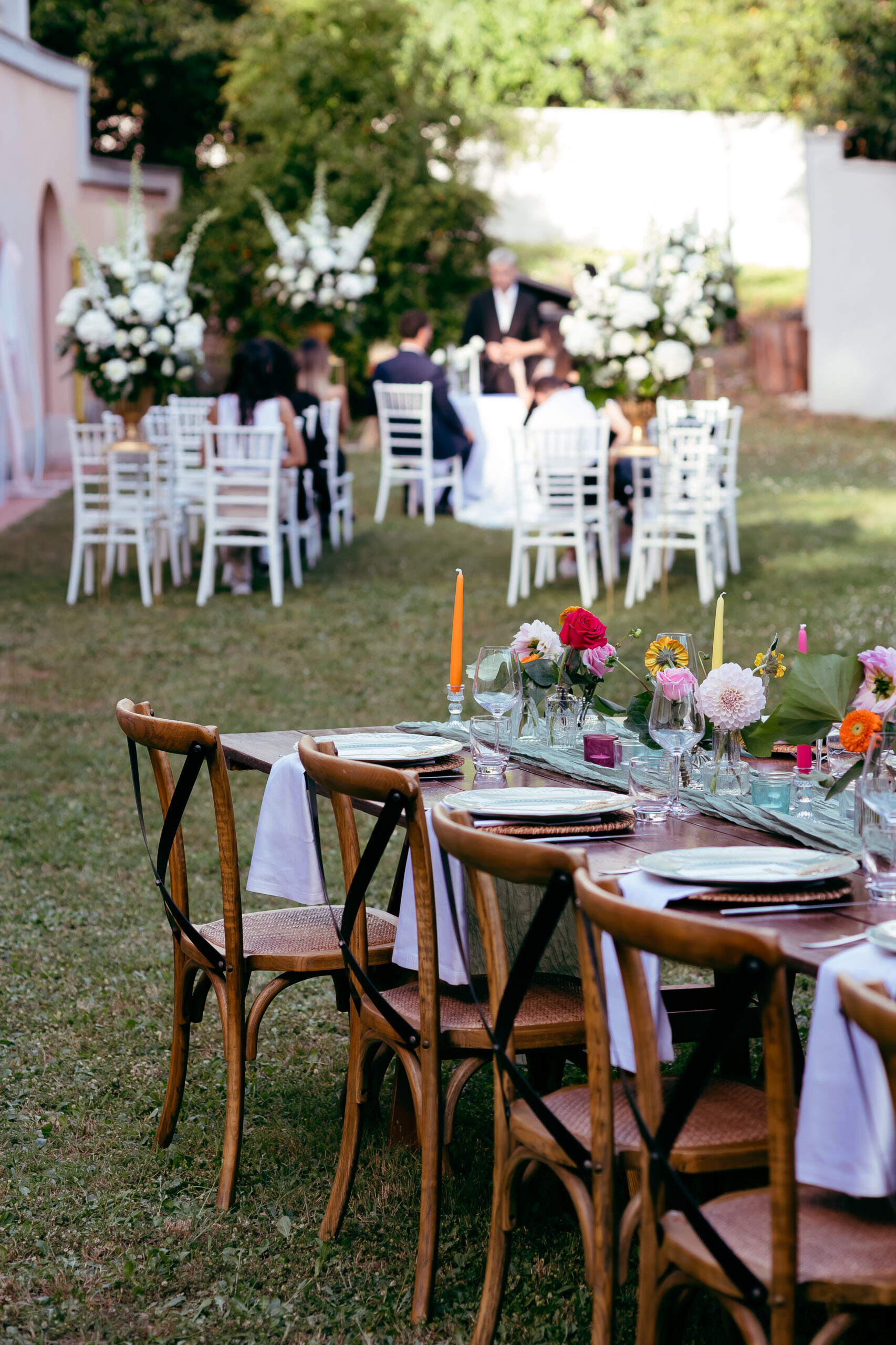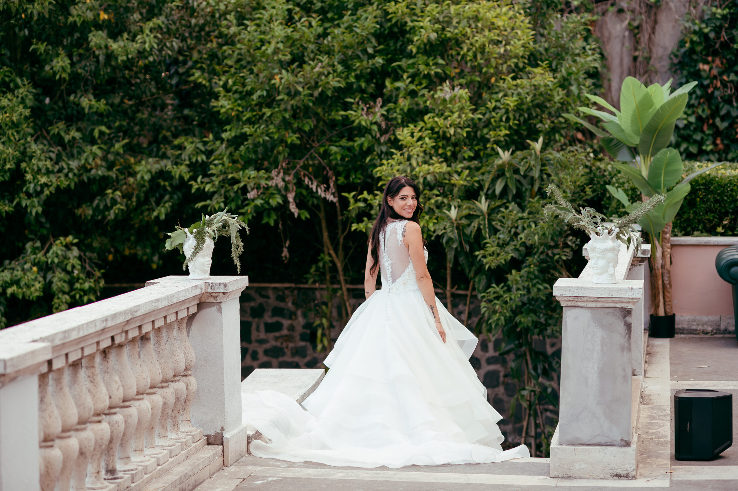 Il giardino della Sala Colonna si apre come un’oasi di tranquillità, incorniciata dal verde rigoglioso che circonda la villa.