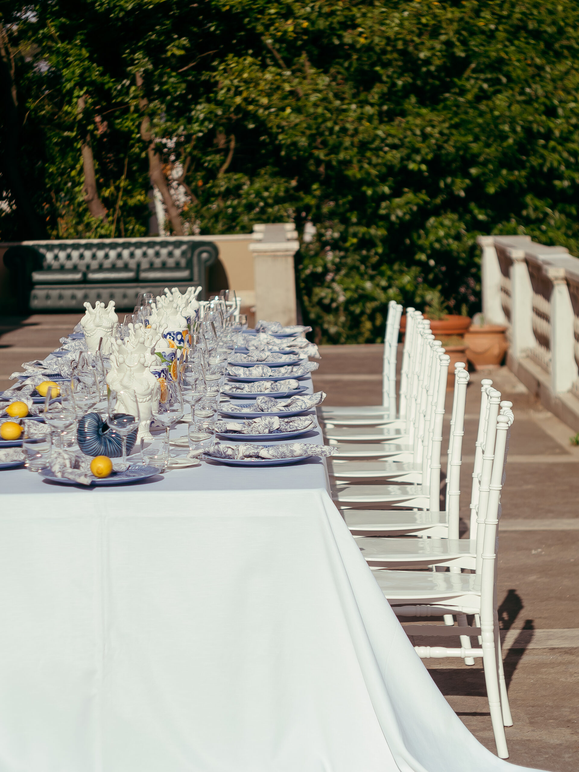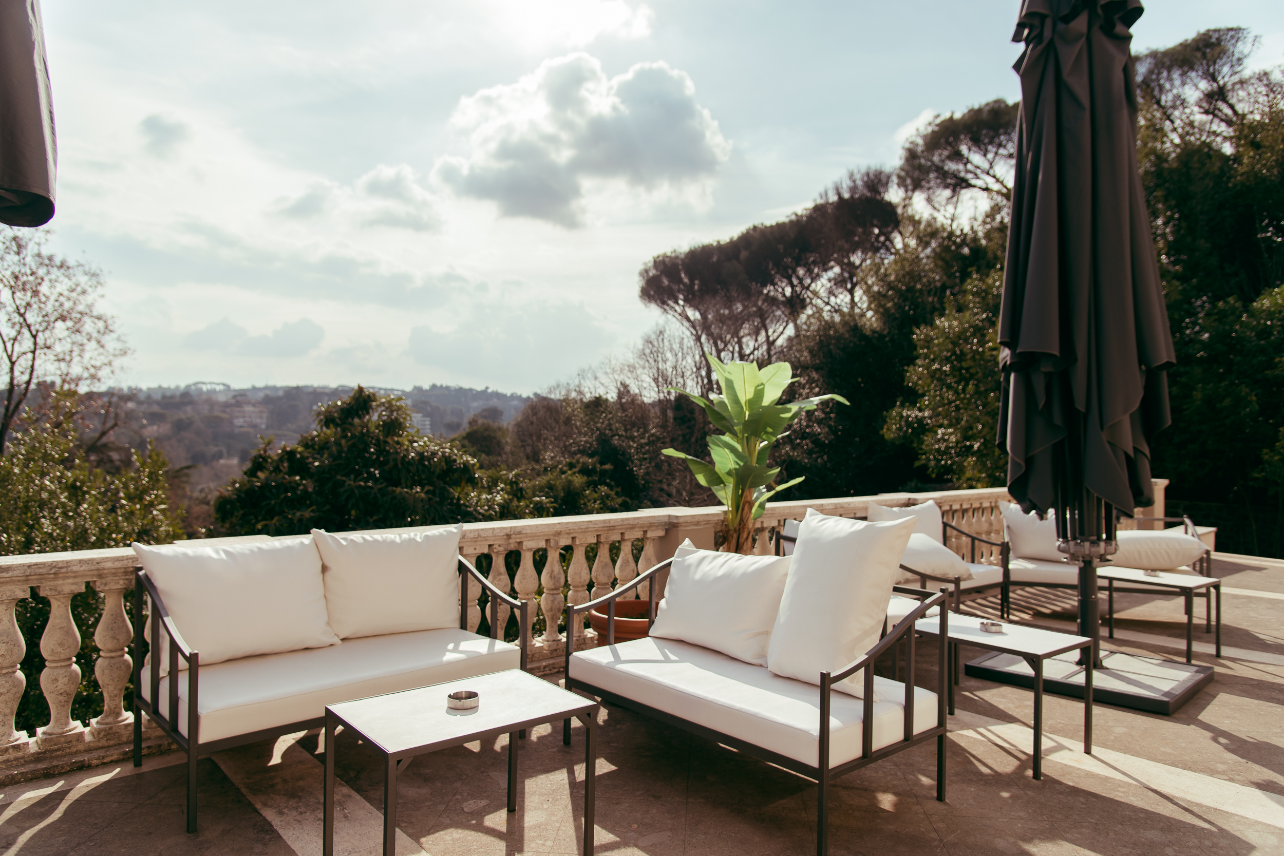 La terrazza della Sala Borghese è un’elegante estensione dello spazio interno, resa preziosa e sofisticata dalla balaustra in marmo con colonnato classico e dalle due ampie scalinate laterali che la collegano al giardino della Sala Colonna. La sua ampiezza e la vista panoramica su Roma Nord creano una perfetta continuità con la sala, offrendo uno spazio esclusivo e versatile, ideale per momenti di convivialità e relax in un’atmosfera raffinata.